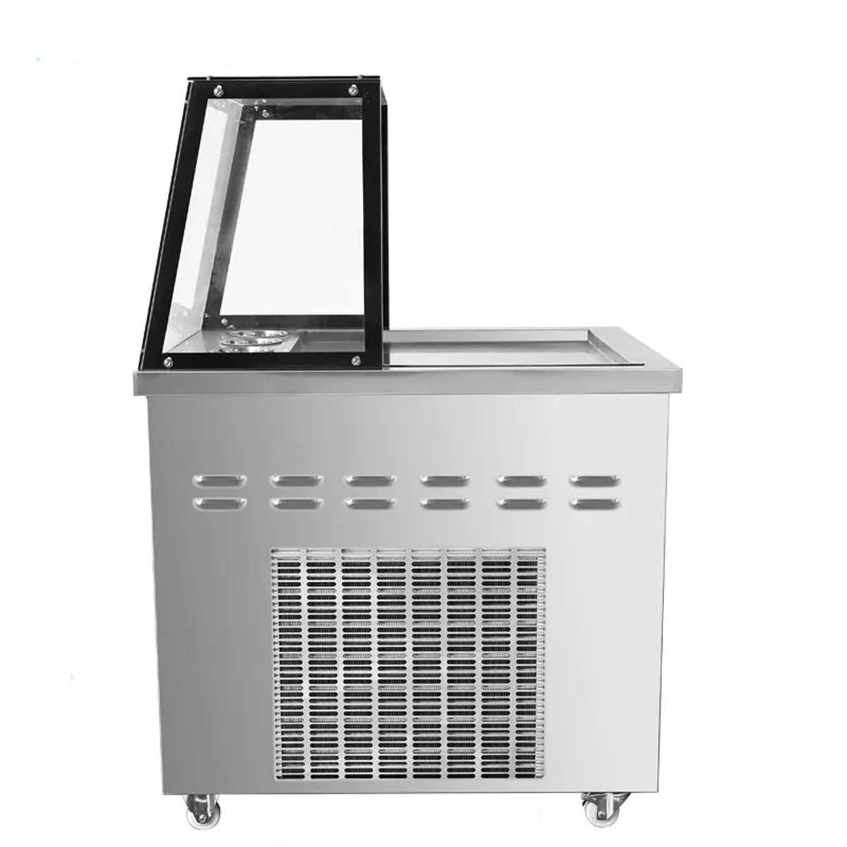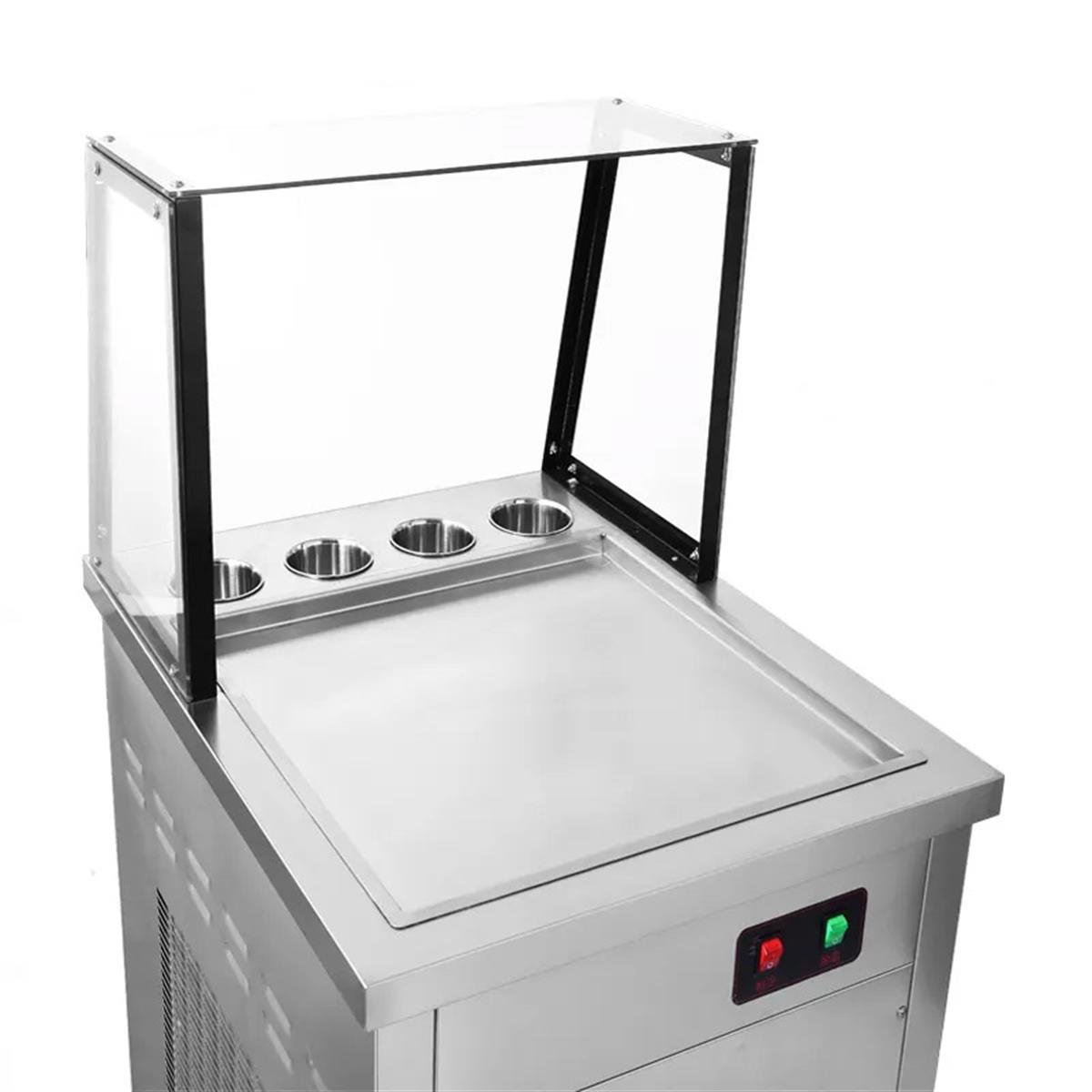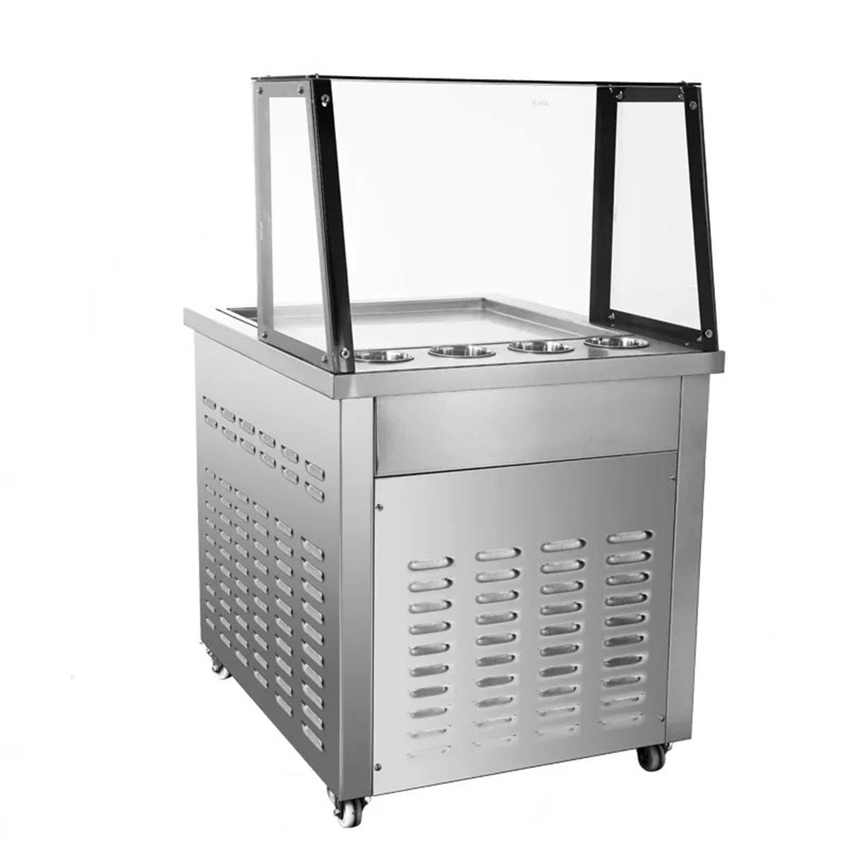 50*50 tava ölçüleri ve daha yüksek kapasitesiyle işletmenizde fark yaratacak bir modeldir. Şık zarif görünüşü ile müşterileri kendine çekecektir.Paslanmaz çelikten imal edilmiştir. Ön tafında bulunan temperli vitrin sayesinde dondurmanız hazırlanırken toz ve kirden korunmuş olacaksınız, ayrıca müşterinizin üretim alanına müdahale etmesini engellemiş olacaksınız. Tava Dondurma makinalarımızda hızlı defrost özelliği bulunmaktadır. Bu özellik tava üzerinde dondurmanızın aşırı donmasını ve yapışmadan kolay rulo olmasını sağlayacaktır. Dijital göstergeniz sayesinde tava yüzeyinizi istediğiniz soğukluk ayarına getirebilirsiniz, bu sayede soğutmayı azaltarak showunuzu istediğiniz kadar uzatabilir, soğutmayı arttırarak fazla biriken müşterilere hızlı servis verebilirsiniz. Mitra tava dondurma modelimizde 4 adet soğutmalı kase bulunmaktadır. Meyvelerinizi bu kaselerde koruyabilirsiniz. Bütün tava dondurma makinelerimizde çevre dostu R410 soğutmalı Panasonic kompresörler kullanılmıştır. Diğer özellikler aşağıdaki tabloda belirtilmiştir.